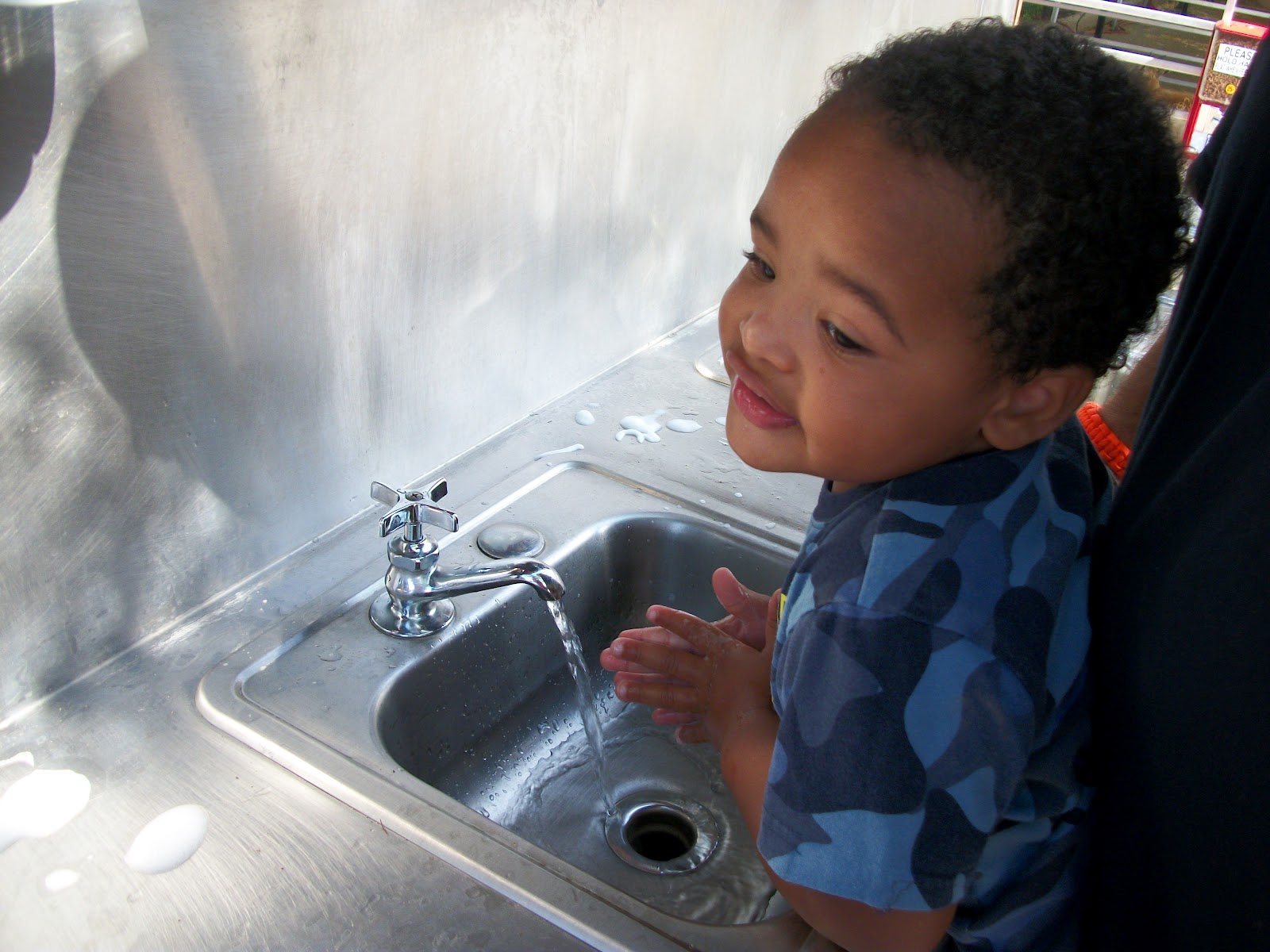 These handwashing stations are located throughout the fair. Actual sinks with soap dispensers and paper towel dispensers. His favorite part of the day? Washing his hands, while singing happy birthday, over and over again. Each time we passed a station, he wanted to wash his hands.