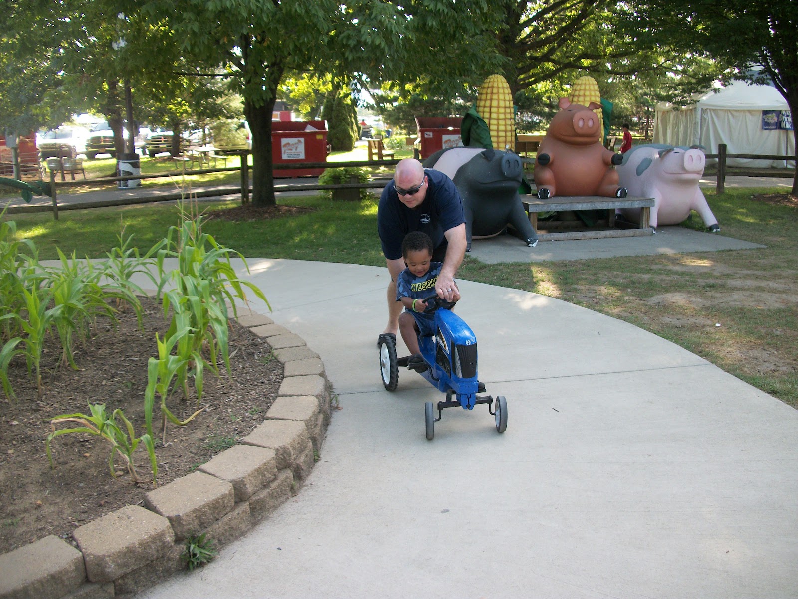 Litte Man ate two corn dogs, some fried Wisconsin cheddar, and some fried veggies. I had a few bites of corn dog, cheddar and veggies, as well as a lemon shakeup. Keith added a chicken-on-a-pita to his menu. We walked a little over 3 miles, saw lots of tractors, petted lots of goats and saw some baby cows.
